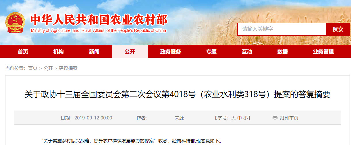 近日,农业农村部对政协十三届全国委员会第二次会议提出的“关于实施乡村振兴战略,提升农户持续发展能力的提案”的建议,在其网站发布了《关于政协十三届全国委员会第二次会议第 4018 号(农业水利类 318 号)提案的答复摘要》,从三个方面进行了相关阐述。
