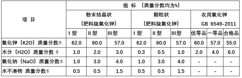 已在2012年6月1日实施的标准将农业氯化钾分为优等品、一等品、合格品三大类。不同的是,此次新颁布的标准并未按上述等级名称进行划分,而是将氯化钾肥料分为粉末结晶状、颗粒状两大类型,对应有Ⅰ型、Ⅱ型、Ⅲ型三挡,且技术指标大幅提升。