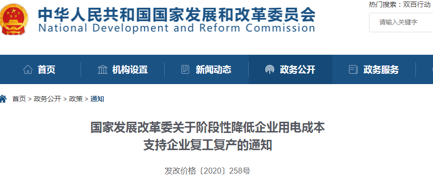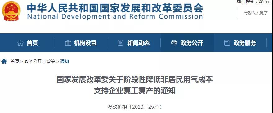 2月22日,国家发展改革委连发两条关于支持企业复工复产、共渡难关的政策通知。一是提前执行淡季天然气价格政策,对化肥等受新冠肺炎疫情影响大的行业给予更大价格优惠;二是降低企业用电成本,电费结算打“九五折”。上述措施均执行至6月30日。