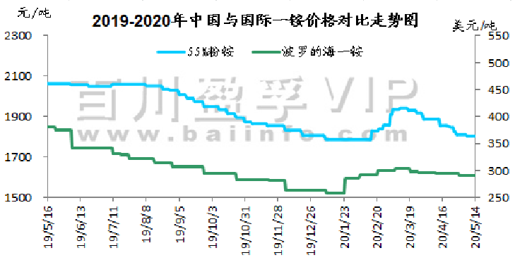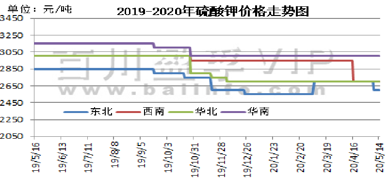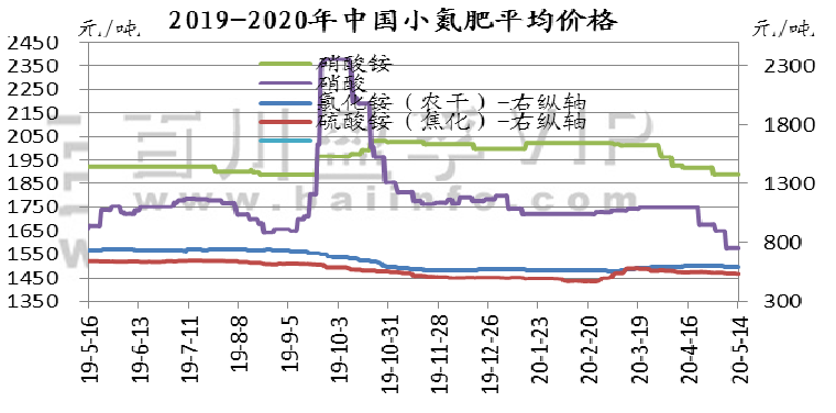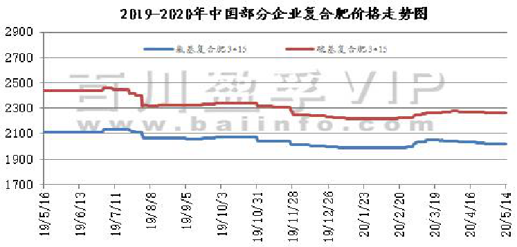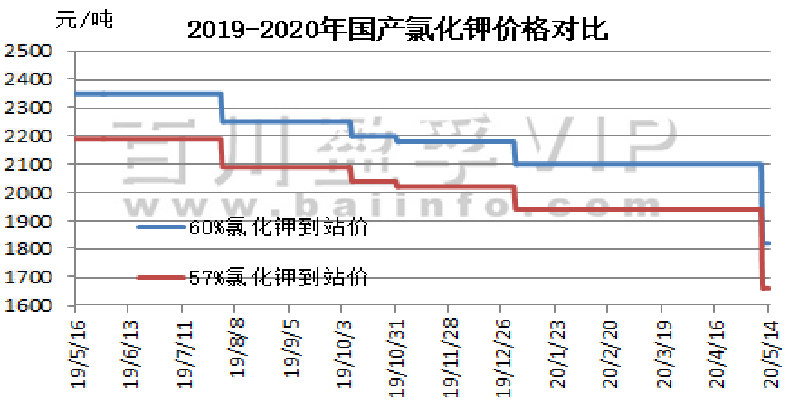 本周氯化钾市场看空气氛较浓,新单成交有限,价格持续走低,国产及进口钾价格均有所下滑,盐湖到站价格下调280元/吨,保底政策依然执行。保税区货源将陆续开始过货。以色列化工与中国签订钾肥大合同,到2020年底,总共供应91万吨钾肥,并有可选量49万吨。合同价格为220美元/吨,延续此前达成的19-21年向中国供应钾肥的框架协议。当地时间2020年5月12日,印度也与加拿大钾肥公司Canpotex达成2020年钾肥进口合同,价格为CFR230美元/吨,较中国进口合同价格高10美元/吨,装运期至2020年12月31日。澳大利亚氯化钾价格下跌,反映出其他地区早期价格下跌趋势。