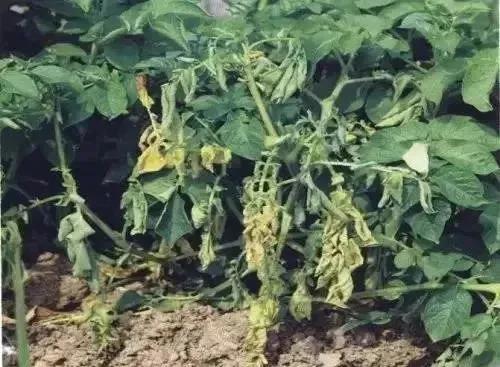 1、马铃薯叶片染病呈苍绿色,下部叶片先萎蔫,逐渐全株下垂致茎叶全部萎蔫死亡,叶脉变褐色,叶片保持青绿色不凋落。