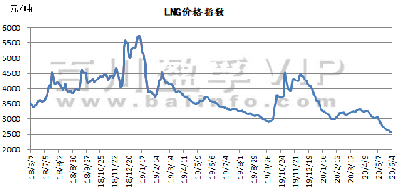 价格指数从5月28日的2629元/吨,下跌至当前2561元/吨,下调68元/吨,本周天然气市场价格涨跌互现,整体呈现稳中降价趋势,总体价格波动幅度在10-350元/吨之间,截止目前价格有一定上下调动,调价幅度对下游接货已经造成一定的影响。整体LNG市场以稳中降价为主。