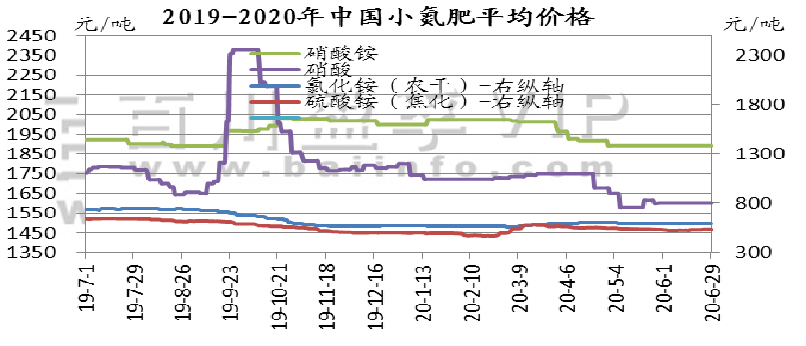 本月国内尿素价格走势呈倒“v”型,上半月上涨,下半月开跌,月末价格较月初价格有20-50元下行。从5月下半月开始,国内尿素检修厂家增多,供应量急剧下行,为尿素价格续涨提供有利条件。其二上半月内需良好,东北及华东局部地区农需追肥备肥持续进行中,接单火爆;新疆地区农需增加,下游接货积极,成交尚可,主产区的库存压力均有所缓解。但郑州局通知,自2020年6月5号18点以后,铁路大票从之前运费优惠的30%,调整为优惠10%,导致山西及河南各厂火运成本有所增加,火运接单积极性减弱。下半月,随着夏季肥需求基本接近收尾,复合肥生产进入淡季,工业需求下滑明显,且市场供应量回升,价格开始走低,且跌速大于上半月涨速。端午节前印标价格明朗,由于内外价差较大,中国出口热情不高,但业内多认为价格下行空间已不大,因此节后贸易商拿货量增加,给月底行情带来复苏迹象。