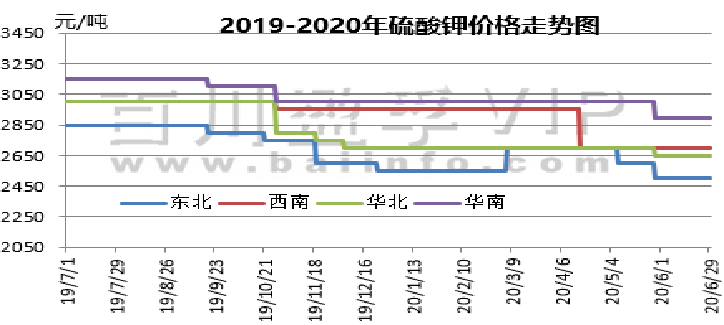 本月硫酸钾市场相对较为上涨,罗钾装置检修后市场供应量有所减少,前期库存基本已消化,厂家基本无库存压力,同时在副产盐酸价格回升,原料成本下降的情况下曼海姆厂家开工回升,市场成交有所回暖,52%含量部分货源较紧俏,市场价格维稳,并有小幅上调趋势。罗钾公司硫酸钾已超额完成上半年销量目标,现有库存预计仅可维持发运至7月下旬。曼海姆硫酸钾50%粉主流出厂价2400-2700元/吨左右,52%粉出厂价2500-2800元/吨左右,优惠幅度在50-100元/吨;东北地区50%粉主流出厂报价2500元/吨;华南地区价格相对较高,50%粉主流出厂报价2900元/吨。青海水盐体系粉状硫酸钾主流到站报价2300-2350元/吨左右,成交有限,实际成交可谈。