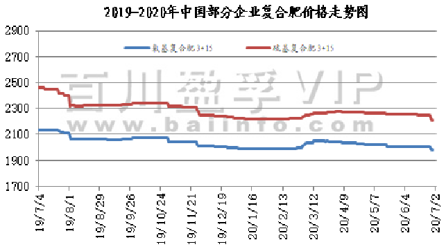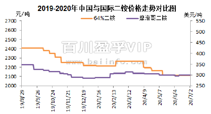 本周(2020.6.29-2020.7.2)二铵市场价格弱势持稳运行,国内市场淡季,需求较少,企业主要重心港口,心态一般。云贵地区64%主流成交价格维持在2050-2100元/吨,湖北主流成交价格2100-2150元/吨。目前国内主流64%成交价格暂稳至2050-2150元/吨。国际方面需求旺盛,由于南亚和东南亚地区需求上涨,中国DAP价格从305-308美元/吨FOB上调至306-309美元/吨FOB。