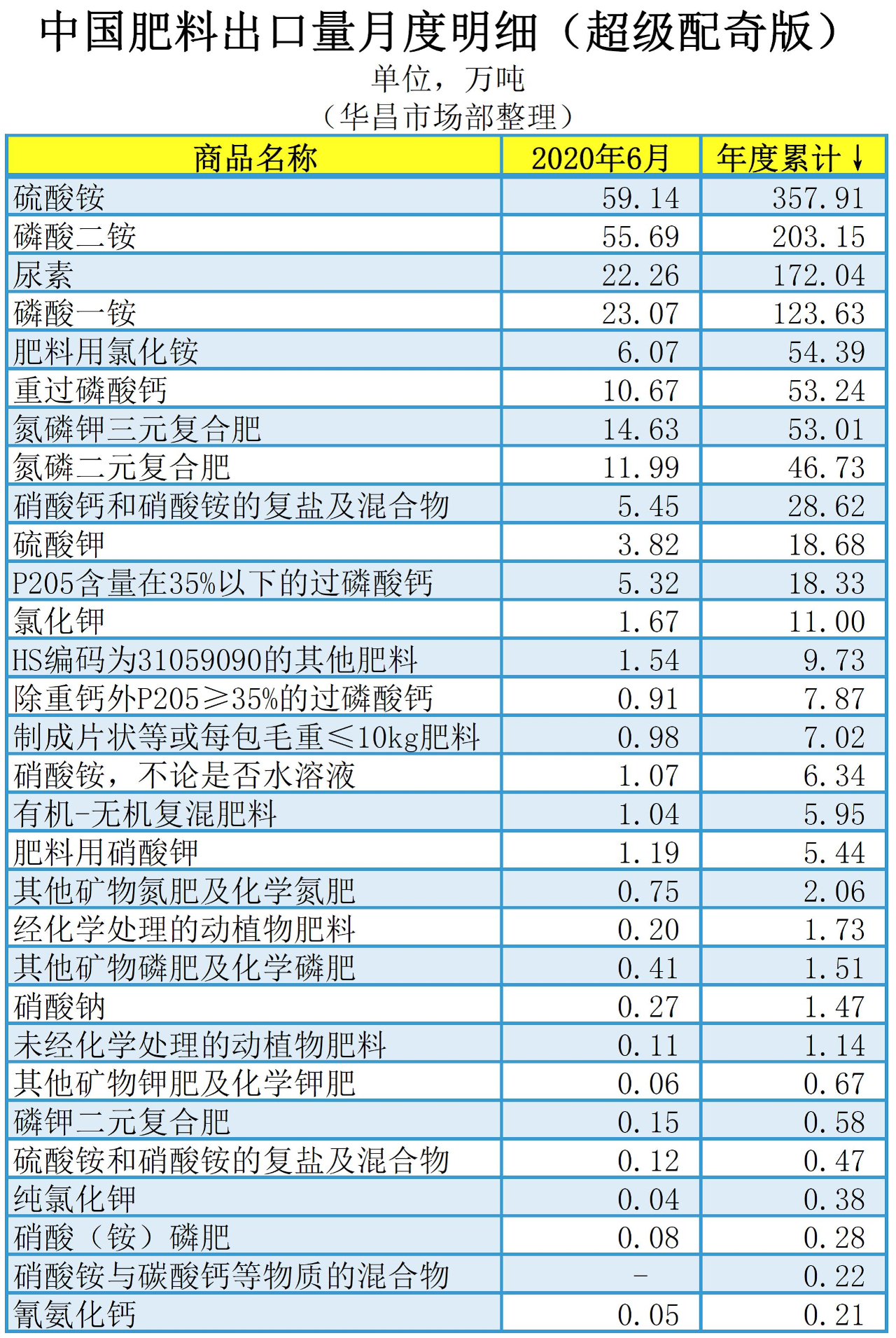 据中国海关统计,2020年1—6月中国共出口各种肥料1193.5万吨(含HS第28章氯化铵、硝酸钾和HS第31章所有肥料),同比减少了5.3%。硫酸铵是累计出口量最多的肥料品种,1-6月累计出口硫酸铵357.91万吨。
