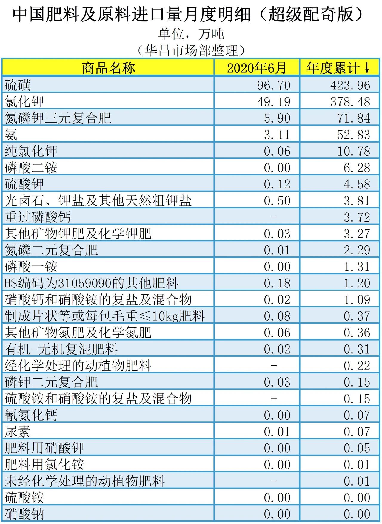 2020年6月当月,中国共进口硫磺96.70万吨,氯化钾(含纯氯化钾)49.25万吨,氮磷钾三元复合肥5.90万吨。