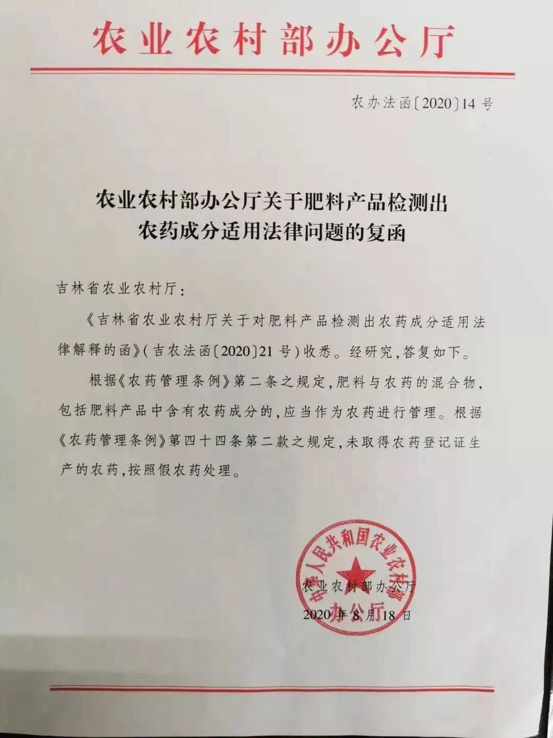 8月18日,农业农村部办公厅在《关于肥料产品检测出农药成分适用法律问题的复函》(农办法函〔2020〕14号)中强调: 根据《农药管理条例》第二条之规定,肥料与农药的混合物,包括肥料产品中含有农药成分的,应当作为农药进行管理。根据《农药管理条例》第四十四条第二款之规定,未取得农药登记证生产的农药,按照假农药处理。