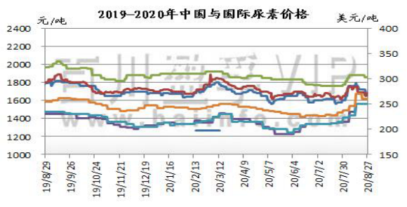 本周国内尿素市场以跌为主,内贸需求清淡及心态悲观下,上周末期间价格再次下行,周内价格先落后稳,伴有小涨,主要由于8月26日印标价格的发布,有力提振国内尿素市场,促使部分区域价格上扬。截止今日,山东及两河出厂报价在1620-1760元/吨,成交1580-1720元/吨。本周港口装卸作业能力仍不足,集港拥堵,内蒙个别厂已暂停集港,企业库存续增,而内贸清淡,成交疲软,小单跟进为主,下游贸易商多谨慎观望。本轮印标价格较为乐观,企业等待价格再次上扬。