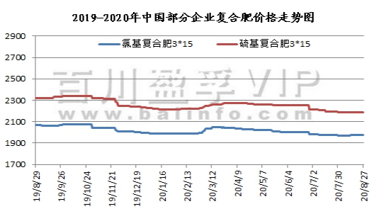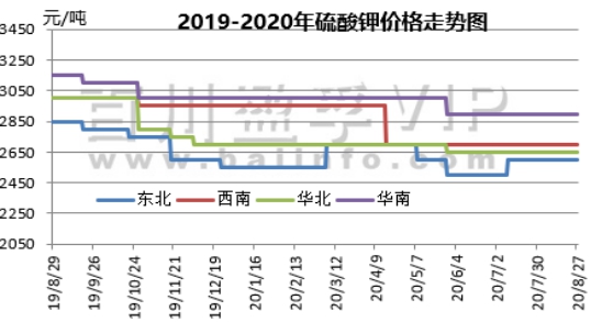本周(2020.8.20-2020.8.27)硫酸钾市场挺价企稳,曼海姆厂家开工维持高位,市场基本没有库存压力,部分货源现货有限,下游需求暂无明显利好回暖。国际市场行情企稳,价格维稳运行。曼海姆硫酸钾50%粉主流出厂价2400-2700元/吨左右,52%粉出厂价2500-2800元/吨左右,优惠幅度在50-100元/吨。东北地区50%粉主流出厂报价2600元/吨;华南地区价格相对较高,50%粉主流出厂报价2900元/吨。青海水盐体系硫酸钾主流到站报价2300-2350元/吨左右,成交有限,实际成交可谈。新疆国投罗钾公司罗中和哈密硫酸钾仓库库存已售罄,预计10月上旬才能正常向市场恢复供货。