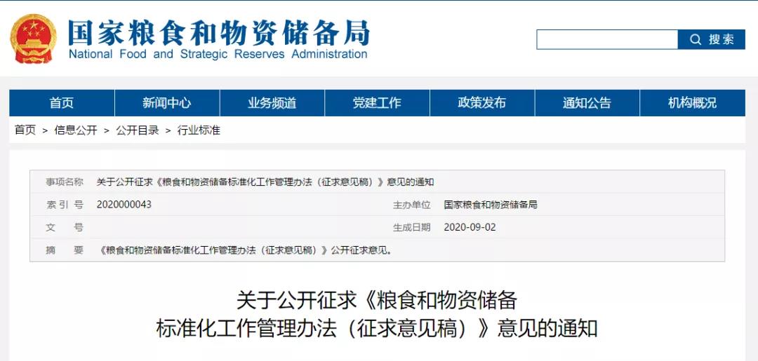9月2日,国家粮食和物资储备局就《粮食和物资储备标准化工作管理办法(征求意见稿)》公开征求意见。《管理办法》主要任务为建立健全粮食和物资储备标准化工作机制,制定并实施粮食和物资储备标准化工作规划计划,建立和完善粮食和物资储备标准体系,制定、组织实施粮食和物资储备标准,以及对粮食和物资储备标准的制定、实施进行监督。