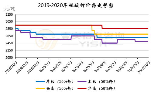 2020.9.24-2020.10.9硫酸钾市场观望企稳,下游需求支撑有限,小单补货为主。原料成本有一定支撑,价格企稳运行为主。云南烟草招标公告发布,全省烟用硫酸钾采购数量179585吨,共划分为六个标段。水溶性硫酸钾采购数量约3898.625吨,最高限价为2900元/吨(含税)。云南烟草招标将对硫酸钾市场需求起到一定利好支撑。曼海姆硫酸钾50%粉主流出厂价2400-2600元/吨左右,52%粉出厂价2500-2700元/吨左右,优惠幅度在50-100元/吨。东北地区50%粉主流出厂报价2550元/吨;华南地区价格相对较高,50%粉主流出厂报价2900元/吨。青海水盐体系硫酸钾主流到站报价2300-2350元/吨左右,成交有限,实际成交可谈。新疆国投罗钾公司装置开车,硫酸钾合同签订量已完成本年度销售任务,目前已预售2021年产品,但控制接单数量。