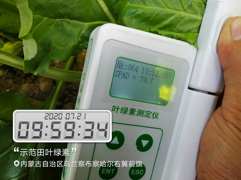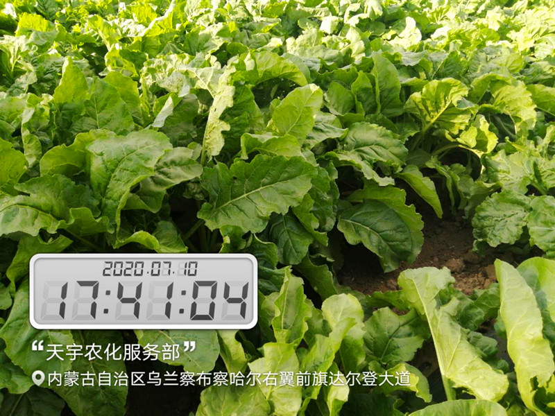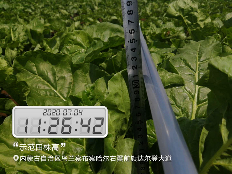 监测记录:对种植户甜菜进行测量,随机选出10株,测量结果取平均值,测量株高、叶绿素含量等。经测量植株株高在800px左右,叶绿素含量在41左右,叶片黑绿,长势足。