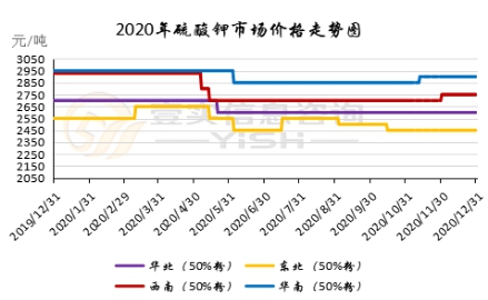 12月硫酸钾市场坚挺中小幅调涨,烟草招标对市场供应有一定消化,市场供应量有限。市场按需成交为主,下游需求小幅回暖,成本支撑持续。曼海姆硫酸钾50%粉主流出厂价2550-2650元/吨左右,52%粉出厂价2650-2750元/吨左右,优惠幅度在50-100元/吨。东北地区50%粉主流出厂报价2500元/吨;华南地区价格相对较高,50%粉主流出厂报价2950元/吨。青海水盐体系硫酸钾供应较为紧俏,价格维持高位,主流到站报价2500元/吨左右,实际成交可谈。国投罗钾公司硫酸钾装置正常生产,罗钾52%粉末硫酸钾现汇价格2750元/吨。