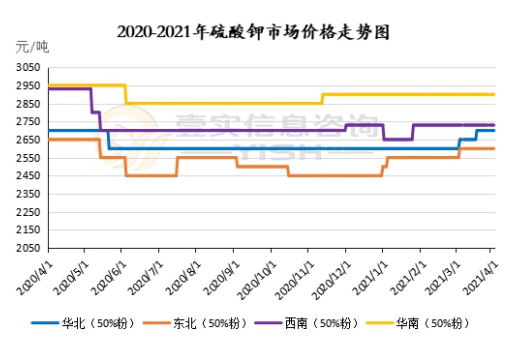 本周(2021.3.26-4.1)硫酸钾市场挺价看涨,市场原料成本压力持续增加,后期市场价格仍有上行趋势。