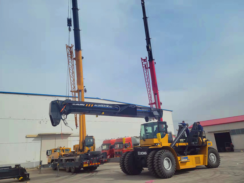 3月29日,一辆超长、超宽特殊拖车缓缓开入天宇汇景集宁园区,天宇汇景集团购买的徐工XCS4531K正面吊正式登场,这位“新伙伴”长11米,高度5米,宽6米,整车质量达71吨,额定承载可达45吨,可起吊20、40英尺型号集装箱。