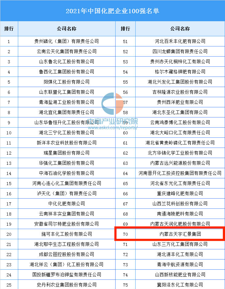 2021年,在武汉召开的“2021(第十四届)中国化肥百强评选发布暨中国化肥产业绿色发展高峰论坛”上,天宇汇景集团荣膺“2021中国化肥企业100强”第70名、“2021中国特种肥料企业50强”第18名、“2021中国生物有机肥企业50强”第46名三项荣誉,摘得发布会奖项的大满贯,再次获得行业肯定!