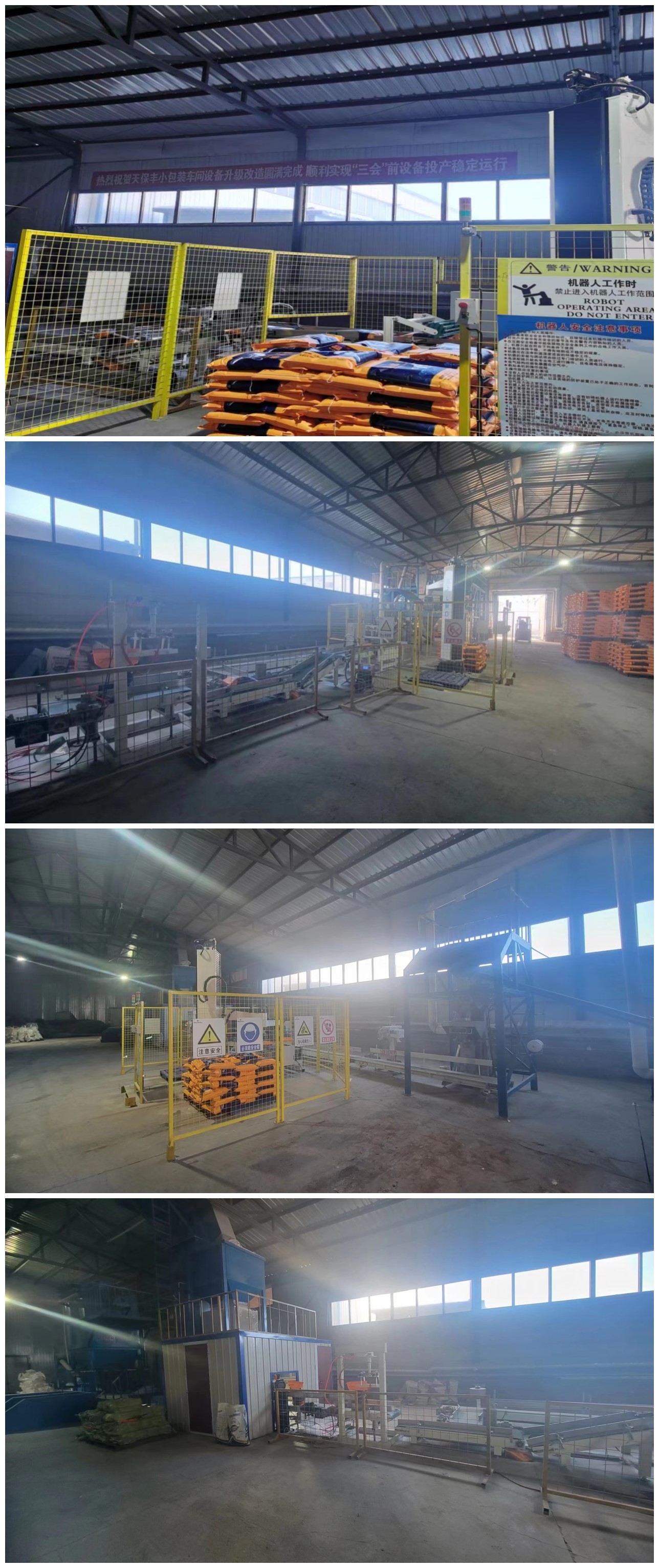 为扩展公司业务,丰富自产产品种类,更好满足市场需求。根据集团公司董事会的要求,由集团投资管理部负责对集宁园区小包装车间进行升级改造,通过对原水溶肥设备进行移位,将BB肥设备的投料口由3台升级为5台,并增加一台机器人码垛机和配套传送装置,实现了水溶肥和BB肥的自动化灌装码垛。极大提升了小包装车间生产效率。