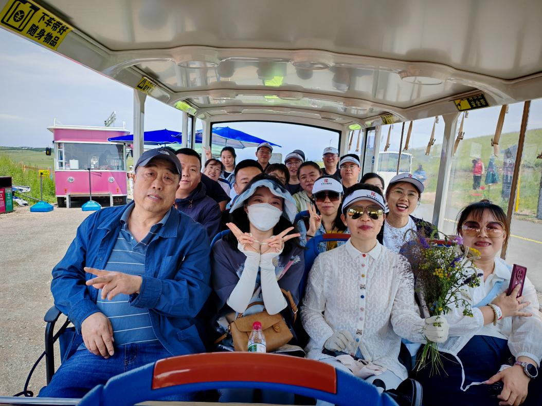 一下车,草原的清新空气与壮阔景色便让大家眼前一亮。稍作休整后,全体员工登上草原的栈道,在这风景绝佳之地合影留念。一张张笑脸定格在镜头中,背后是蓝天白云与无垠草原,仿佛将团队的活力与草原的生机完美融合。