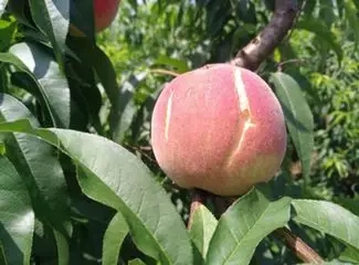 桃生产上裂果现象发生较重,不仅降低了产量,而且也影响了外观品质和经济效益。裂果多发生在桃果成熟期,桃果硬核期结束至成熟前发病,以第2次果实膨大始期发病最多。有的在果顶到果梗方向发生纵裂,有的在果顶部发生不规则的裂纹,纵横交错,形状不一;有的在向阳面灼烧处呈龟裂状裂缝,遇雨极易被杂菌污染,降低商品价值,且易腐烂。气压突然剧烈变化而使果肉膨胀,果皮开裂。