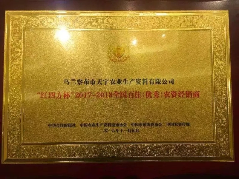 我集团旗下乌兰察布市天宇农业生产资料有限责任公司再次成功被评为“红四方杯”2017-2018全国百佳(优秀)农资经销商称号,公司董事长陈璞获评“懂爱”的人称号。