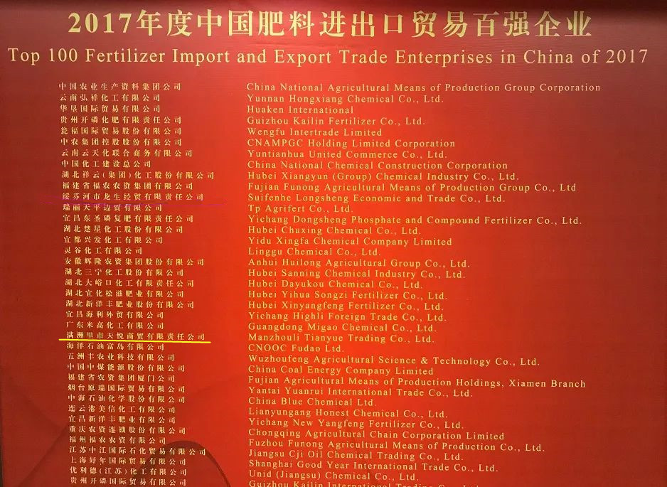 我集团旗下满洲里市天悦商贸有限责任公司荣膺“2017年度中国肥料进出口贸易百强企业”称号,位列第27位。天宇汇景集团总裁陈璞代表满洲里市天悦商贸有限责任公司参会并领奖。